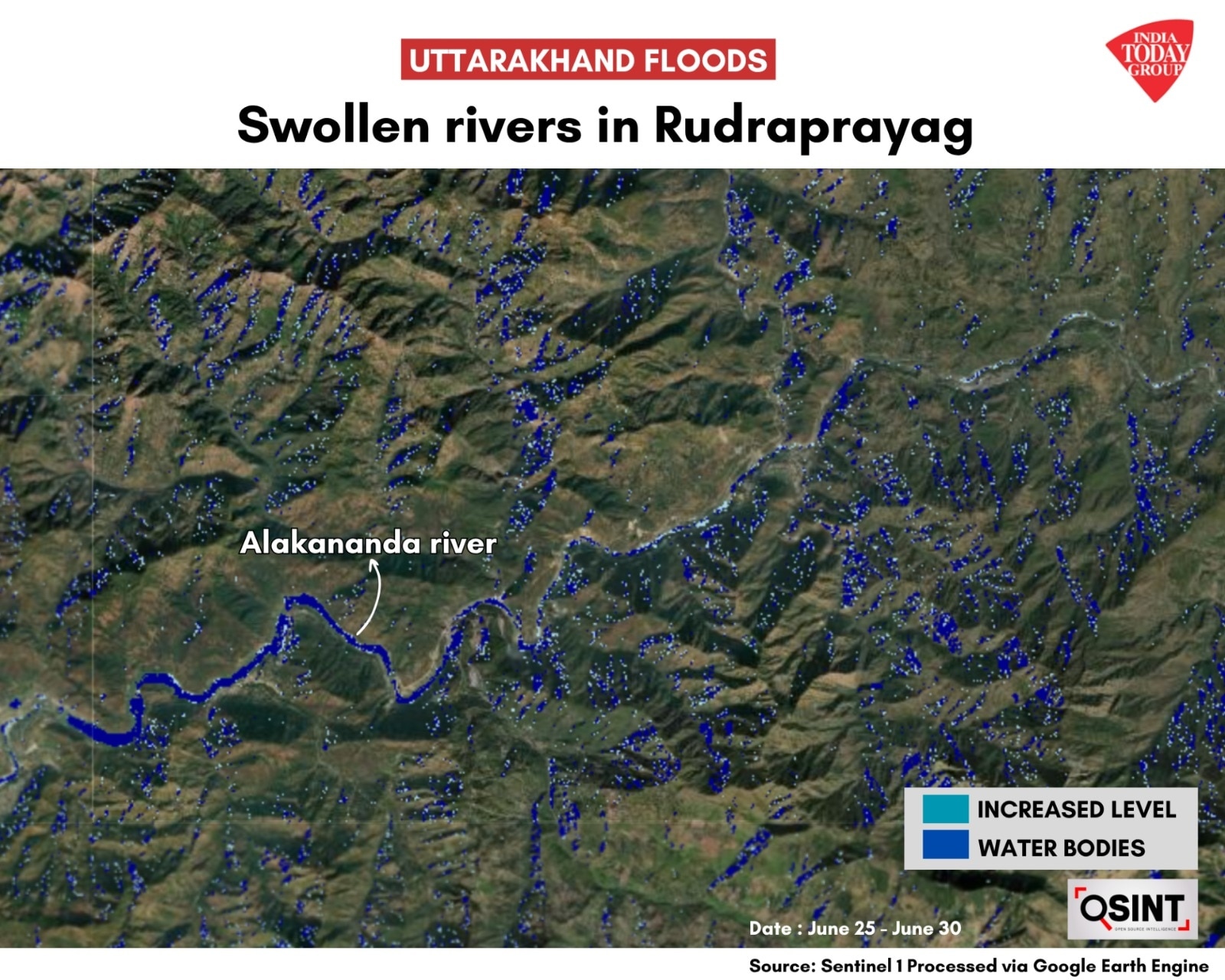 रुद्रप्रयाग में अलकनंदा और मंदाकिनी नदियों का जलस्तर खतरे के निशान से ऊपर चला गया है जिससे नदियों के किनारे बसे घरों को खाली कराया जा रहा है. सैटेलाइट से मिले डेटा से साफ देखा गया है कि अलकनंदा नदी के किनारे कई जगहों पर पानी फैल चुका है. स्थिति गंभीर है और लोगों को सतर्क रहने की सलाह दी गई है.
