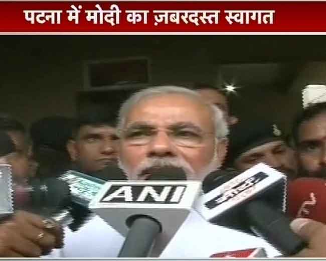 गुजरात के मुख्यमंत्री नरेंद्र मोदी रविवार को पटना पहुंचे. एयरपोर्ट पर ही समर्थकों ने उनके समर्थन में खूब नारेबाजी की और उन्हें प्रधानमंत्री पद का दावेदार बताया. मोदी रविवार को यहां बीजेपी नेता कैलाशपति मिश्र की अंतिम यात्रा में शामिल होने के लिए पहुंचे थे.