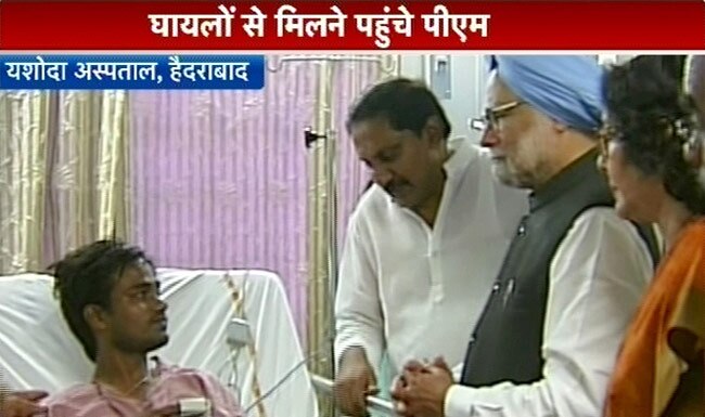 आंध्र प्रदेश की राजधानी हैदराबाद में दो सिलसिलेवार बम विस्फोटों के तीन दिन बाद रविवार को प्रधानमंत्री मनमोहन सिंह ने विस्फोट स्थल का दौरा किया. प्रधानमंत्री के साथ आंध्र प्रदेश के राज्यपाल ई. एस. एल. नरसिम्हन तथा मुख्यमंत्री एन. किरण कुमार रेड्डी भी थे. इसके बाद प्रधानमंत्री मनमोहन सिंह ब्लास्ट में जख्मी हुए लोगों से भी मुलाकात की.