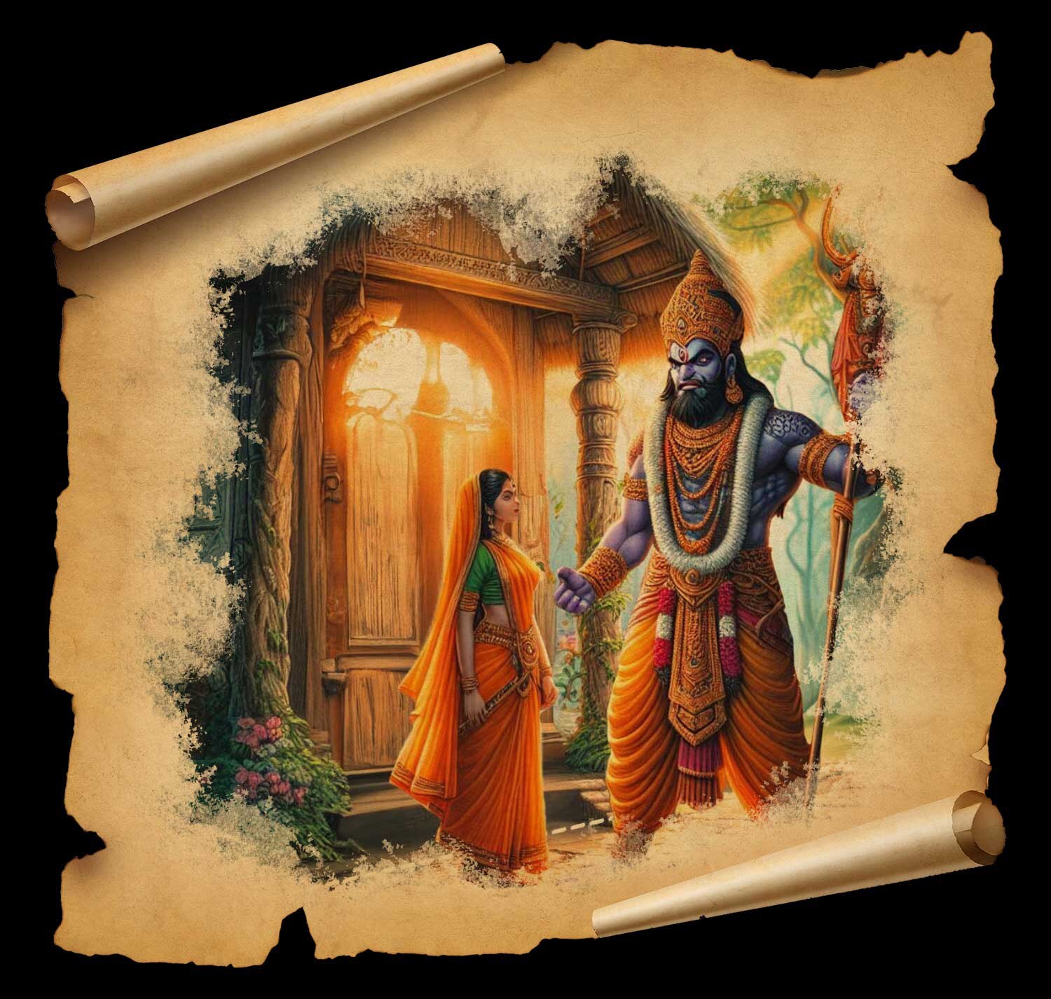 श्रीराम की आवाज पर लक्ष्मणजी उन्हें ढूंढने वन को चले गए. रावण सूना मौका देखकर संन्यासी के वेष में श्रीसीताजी के समीप आया. जिसके डर से देवता और दैत्य तक इतना डरते हैं कि रात को नींद नहीं आती और दिन में भरपेट अन्न नहीं खाते. वही दस सिरवाला रावण कुत्ते की तरह इधर-उधर ताकता हुआ चोरी के लिये चला. सीताजी ने कहा- हे यति गोसाईं! सुनो, तुमने तो दुष्ट की तरह वचन कहे. तब रावण ने अपना असली रूप दिखलाया और जब नाम सुनाया तब तो सीताजी भयभीत हो गयीं. उन्होंने गहरा धीरज धरकर कहा- 'अरे दुष्ट! खड़ा तो रह, प्रभु आ गये. जैसे सिंह की स्त्री को तुच्छ खरगोश चाहे, वैसे ही अरे राक्षसराज! तू मेरी चाह करके काल के वश हुआ है. ये वचन सुनते ही रावण को क्रोध आ गया, परन्तु मन में उसने सीताजी के चरणों की वन्दना करके सुख माना. फिर क्रोध में भरकर रावण ने सीताजी को रथपर बैठा लिया और वह बड़ी उतावली के साथ आकाशमार्ग से चला; किन्तु डर के मारे उससे रथ हांका नहीं जाता था.