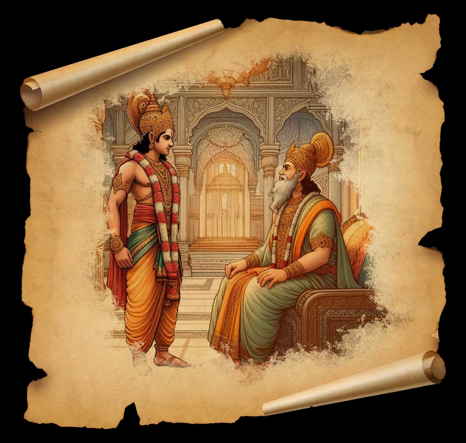 सब लोगों का समाधान करके (किसी तरह समझा-बुझाकर) सुमन्त्र वहां गए, जहां सूर्यकुल के तिलक श्रीरामचन्द्रजी थे. श्रीरामचन्द्रजी ने सुमन्त्र को आते देखा तो पिता के समान समझकर उनका आदर किया. श्रीरामचन्द्रजी के मुख को देखकर और राजा की आज्ञा सुनाकर वे रघुकुल के दीपक श्रीरामचन्द्रजी को अपने साथ लिवा चले. श्रीरामचन्द्रजी मन्त्री के साथ बुरी तरह से जा रहे हैं, यह देखकर लोग जहां-तहां विषाद कर रहे हैं. रघुवंशमणि श्रीरामचन्द्रजी ने जाकर देखा कि राजा अत्यन्त ही बुरी हालत में पड़े हैं, मानो सिंहनी को देखकर कोई बूढ़ा गजराज सहमकर गिर पड़ा हो. राजा के ओठ सूख रहे हैं और सारा शरीर जल रहा है, मानो मणि के बिना सांप दुखी हो रहा हो. पास ही क्रोध से भरी कैकेयी को देखा, मानो साक्षात् मृत्यु ही बैठी राजा के जीवन की अन्तिम घड़ियां गिन रही हो. श्रीरामचन्द्रजी का स्वभाव कोमल और करुणामय है. उन्होंने अपने जीवन में पहली बार यह दुख देखा; इससे पहले कभी उन्होंने दुख सुना भी न था. तो भी समय का विचार करके हृदय में धीरज धरकर उन्होंने मीठे वचनों से माता कैकेयी से पूछा- हे माता! मुझे पिताजी के दुख का कारण कहो ताकि जिससे उसका निवारण हो वह यत्न किया जाय. कैकेयी ने कहा- हे राम! सुनो, सारा कारण यही है कि राजा का तुमपर बहुत स्नेह है.