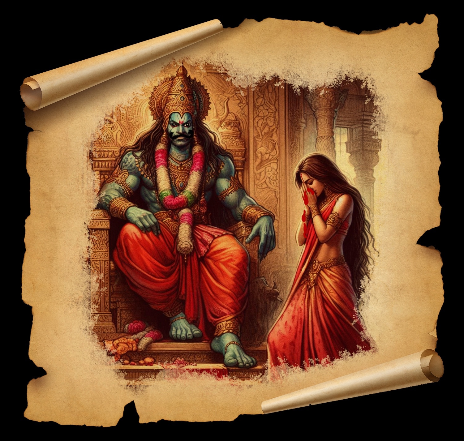 शत्रु, रोग, अग्नि, पाप, स्वामी और सर्प को छोटा करके नहीं समझना चाहिए. ऐसा कहकर शूर्पणखा अनेक प्रकार से विलाप करके रोने लगी. रावण की सभा के बीच वह व्याकुल होकर पड़ी हुई बहुत प्रकार से रो-रोकर कह रही है कि अरे दशग्रीव! तेरे जीते-जी मेरी क्या ऐसी दशा होनी चाहिए? शूर्पणखा के वचन सुनते ही सभासद अकुला उठे. उन्होंने शूर्पणखा की बांह पकड़कर उसे उठाया और समझाया. लंकापति रावण ने कहा- अपनी बात तो बता, किसने तेरे नाक-कान काट लिए?. वह बोली- अयोध्या के राजा दशरथ के पुत्र, जो पुरुषों में सिंह के समान हैं, वन में शिकार खेलने आए हैं. मुझे उनकी करनी ऐसी समझ पड़ी है कि वे पृथ्वी को राक्षसों से रहित कर देंगे. जिनकी भुजाओं का बल पाकर हे दशमुख! मुनिलोग वन में निर्भय होकर विचरने लगे हैं. वे देखने में तो बालक हैं, पर हैं काल के समान. वे परम धीर, श्रेष्ठ धनुर्धर और अनेकों गुणों से युक्त हैं. दोनों भाइयों का बल और प्रताप अतुलनीय है. वे दुष्टों के वध करने में लगे हैं और देवता तथा मुनियों को सुख देने वाले हैं. वे शोभा के धाम हैं, 'राम' ऐसा उनका नाम है. उनके साथ एक तरुणी सुन्दरी स्त्री है. विधाता ने उस स्त्री को ऐसी रूप की राशि बनाया है कि सौ करोड़ रति (कामदेव की स्त्री) उसपर निछावर हैं. उन्हीं के छोटे भाई ने मेरे नाक-कान काट डाले. मैं तेरी बहन यह सुनकर वे मेरी हंसी करने लगे.