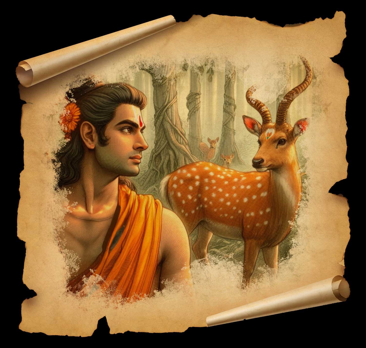 वह मन-ही-मन सोचने लगा अपने परम प्रियतम को देखकर नेत्रों को सफल करके सुख पाऊंगा. जानकीजी सहित और छोटे भाई लक्ष्मणजी समेत कृपानिधान श्रीरामजी के चरणों में मन लगाऊंगा. जिनका क्रोध भी मोक्ष देने वाला है और जिनकी भक्ति उन अवश (किसी के वश में न होने वाले स्वतन्त्र भगवान) को भी वश में करने वाली है, अहा! वे ही आनन्द के समुद्र श्रीहरि अपने हाथों से बाण सन्धान कर मेरा वध करेंगे! धनुष-बाण धारण किए मेरे पीछे-पीछे पृथ्वी पर दौड़ते हुए प्रभु को मैं फिर-फिरकर देखूंगा. मेरे समान धन्य दूसरा कोई नहीं है. जब रावण उस वन के (जिस वन में श्रीरघुनाथजी रहते थे) निकट पहुंचा, तब मारीच कपटमृग बन गया. वह अत्यन्त ही विचित्र था, कुछ वर्णन नहीं किया जा सकता. सोने का शरीर मणियों से जड़कर बनाया था. सीताजी ने उस परम सुन्दर हिरन को देखा, जिसके अंग-अंग की छटा अत्यन्त मनोहर थी. वे कहने लगीं- हे देव! हे कृपालु रघुवीर! सुनिये. इस मृग की छाल बहुत ही सुन्दर है. जानकीजी ने कहा- हे सत्यप्रतिज्ञ प्रभो! इसको मारकर इसका चमड़ा ला दीजिये. तब श्रीरघुनाथजी मारीच के कपटमृग बनने का सब कारण जानते हुए भी, देवताओं का कार्य बनाने के लिये हर्षित होकर उठे. हिरन को देखकर श्रीरामजी ने कमर में फेंटा बांधा और हाथ में धनुष लेकर उसपर सुन्दर (दिव्य) बाण चढ़ाया. फिर प्रभु ने लक्ष्मणजी को समझाकर कहा- हे भाई! वन में बहुत से राक्षस फिरते हैं.