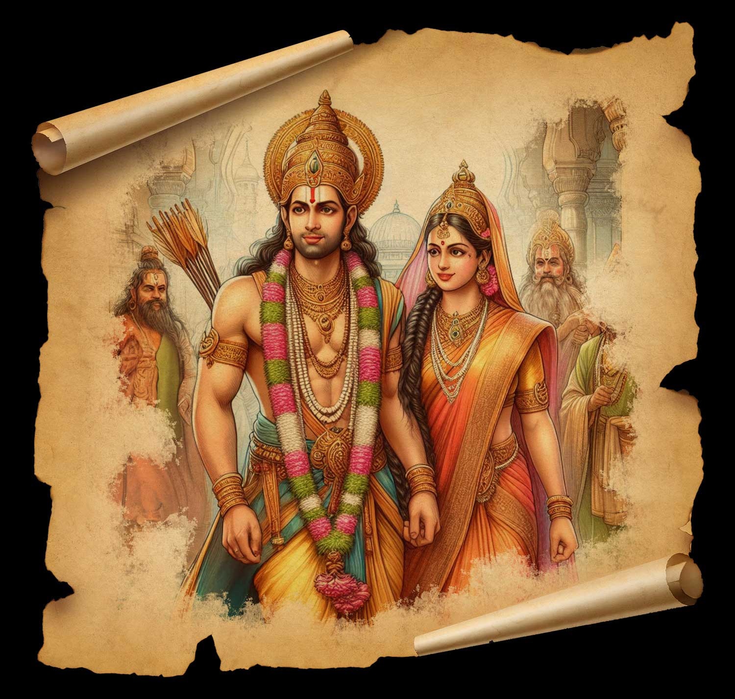 श्रेष्ठ देवांगनाएं जो सुंदर मनुष्य-स्त्रियों के वेष में हैं, सभी स्वभाव से ही सुन्दरी और श्यामा (सोलह वर्ष की अवस्था वाली) हैं. उनको देखकर रनिवास की स्त्रियां सुख पाती हैं और बिना पहचान के ही वे सबको प्राणों से भी प्यारी हो रही हैं. उन्हें पार्वती, लक्ष्मी और सरस्वती के समान जानकर रानी बार-बार उनका सम्मान करती हैं. रनिवास की स्त्रियां और सखियां सीताजी का श्रृंगार करके, मंडली बनाकर, प्रसन्न होकर उन्हें मंडप में लिवा चलीं. सुंदर मंगल का साज सजकर [रनिवास की] स्त्रियां और सखियां आदरसहित सीताजी को लिवा चलीं. सभी सुन्दरियां सोलहों शृंगार किए हुए मतवाले हाथियों की चाल से चलने वाली हैं. उनके मनोहर गान को सुनकर मुनि ध्यान छोड़ देते हैं और कामदेव की कोयलें भी लजा जाती हैं. पायजेब, पैंजनी और सुंदर कंकण ताल की गतिपर बड़े सुंदर बज रहे हैं. सहज ही सुन्दरी सीताजी स्त्रियों के समूह में इस प्रकार शोभा पा रही हैं, मानो छवि रूपी ललनाओं के समूह के बीच साक्षात परम मनोहर शोभारूपी स्त्री सुशोभित हो. सीताजी की सुंदरता का वर्णन नहीं हो सकता, क्योंकि बुद्धि बहुत छोटी है और मनोहरता बहुत बड़ी है. रूप की राशि और सब प्रकार से पवित्र सीताजी को बारातियों ने आते देखा. सभी ने उन्हें मन-ही-मन प्रणाम किया. श्रीरामचन्द्रजी को देखकर तो सभी पूर्णकाम (कृतकृत्य) हो गए. राजा दशरथजी पुत्रों सहित हर्षित हुए. उनके हृदय में जितना आनंद था, वह कहा नहीं जा सकता.