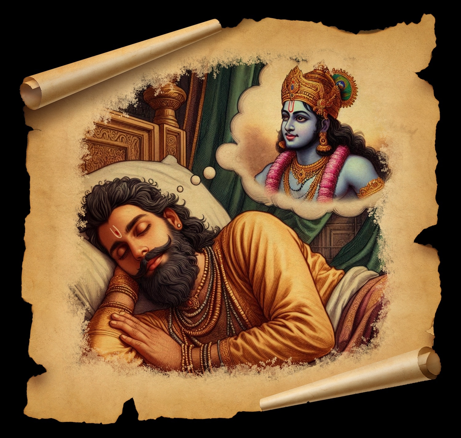 राजा का नियम था कि वह अपने दिन की शुरुआत कृष्ण पूजा से करता था और फिर राज दरबार के काम पूरे कर जब सोने जाता तो उससे पहले श्रीकृष्ण को सुलाकर तब सोता. इसी तरह एक रात उसने सपने में देखा कि वह एक सरोवर के किनारे बैठा ध्यान कर रहा है. वातावरण बहुत ही सुंदर है. इतने में एक कौवा कांव-कांव करते हुए शोर मचाते हुए वहां आया, जिसकी आवाज सुनकर राजा का ध्यान भंग हुआ. राजा ने देखा कि प्यासे कौवे ने जैसे ही सरोवर का जल पीया, उसके प्रभाव से वह एक दिव्य पुरुष में बदल गया. इतने में वैकुंठ का एक पार्षद रथ लेकर आसमान से उतरा और उसे वैकुंठ ले गया. राजा बहुत चकित था. उसने इधर-उधर नजर दौड़ाई तो सामने एक गुफा नजर आई जिसके मुहाने से नीला प्रकाश निकल रहा था. ऐसा सपना देखते हुए राजा की आंख खुल गई और वह उठ बैठा.