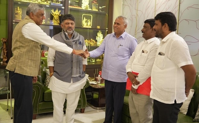 कर्नाटक में जारी पावर टशल के बीच डिप्टी सीएम डीके शिवकुमार ने दो विधायकों से मुलाकात की है. डीके शिवकुमार ने शुक्रवार को नांजे गौड़ा और मंजूनाथ से मुलाकात की है. शिवकुमार की विधायकों से मुलाकात को लेकर अधिक जानकारी सामने नहीं आई है, लेकिन इसे कर्नाटक के ताजा सियासी हालात से जोड़कर देखा जा रहा है. इस मुलाकात की तस्वीर सामने आई है.