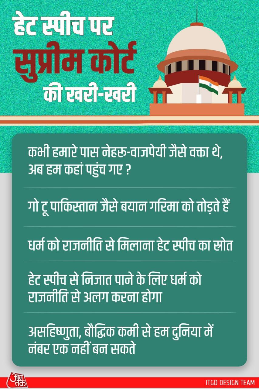 कोर्ट ने कहा कि कभी हमारे पास नेहरू, वाजपेयी जैसे वक्ता हुआ करते थे. दूर-दराज से लोग उन्हें सुनने के लिए आते थे. अब लोगों की भीड़ फालतू तत्वों को सुनने के लिए आती है. हेट स्पीच से निजात पाने के लिए धर्म को राजनीति से अलग करना होगा. फिलहाल सुप्रीम कोर्ट इस मामले में 28 अप्रैल को अगली सुनवाई करेगी.