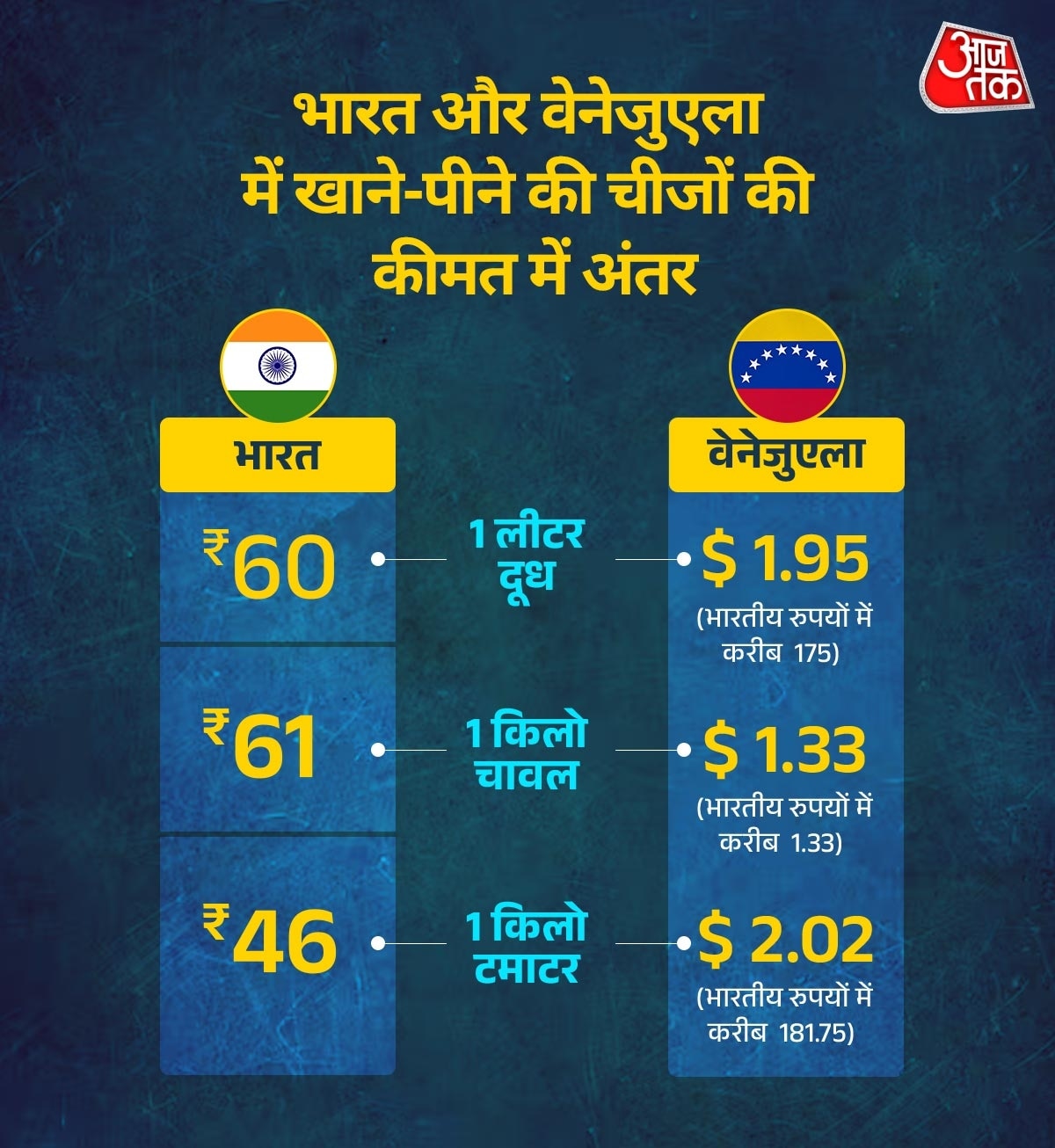 अगर भारत और वेनेजुएला में खाने-पीने की चीजों की कीमतों की तुलना की जाए तो अंतर बहुत बड़ा है. भारत में जहां दूध (रेगुलर 1 लीटर) की कीमत 60.98 रुपये के आसपास है तो वहीं, वेनेजुएला में आपको एक लीटर दूध के लिए करीब 175 रुपये चुकाने होंगे.