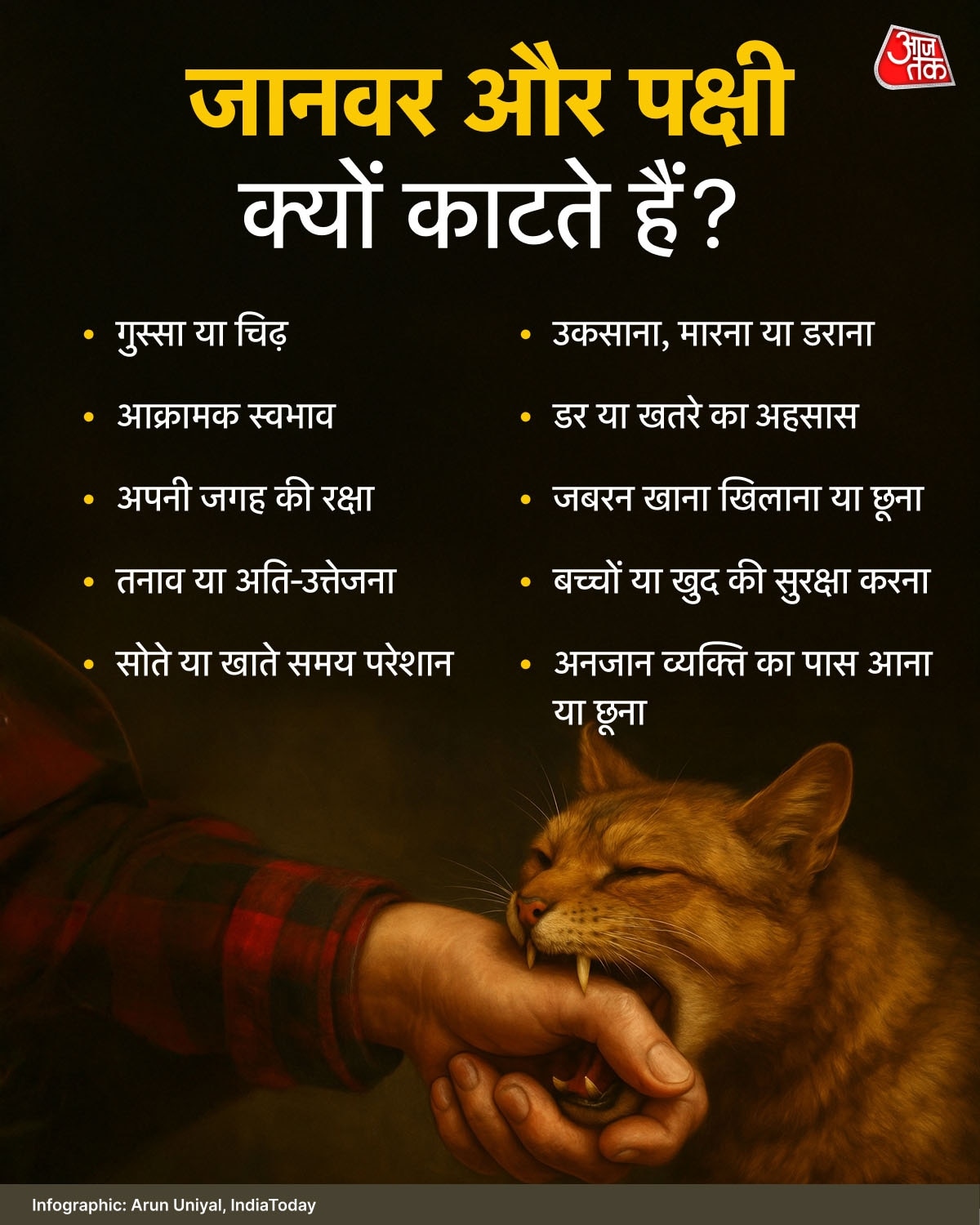 Healthline के मुताबिक, जानवर तब काट सकते हैं जब उन्हें उकसाया जाए या उन्हें मारने या डराने की कोशिश की जाए. उदाहरण के लिए अगर आप कुत्ते के खाते समय उसका खाना हटाने की कोशिश करते हैं जब उसे भूख लग रही है तो वो काट सकता है. अगर आप अपने पालतू जानवर को छेड़ते हैं तो भी ऐसा हो सकता है. हालांकि, कई मामलों में जानवरों के काटने का कारण बिना उकसावे के होता है. बिना उकसावे के काटने की घटना भी काफी कॉमन होती हैं जो उनके अग्रेसिव या असुरक्षा की भावना को दिखाता है.