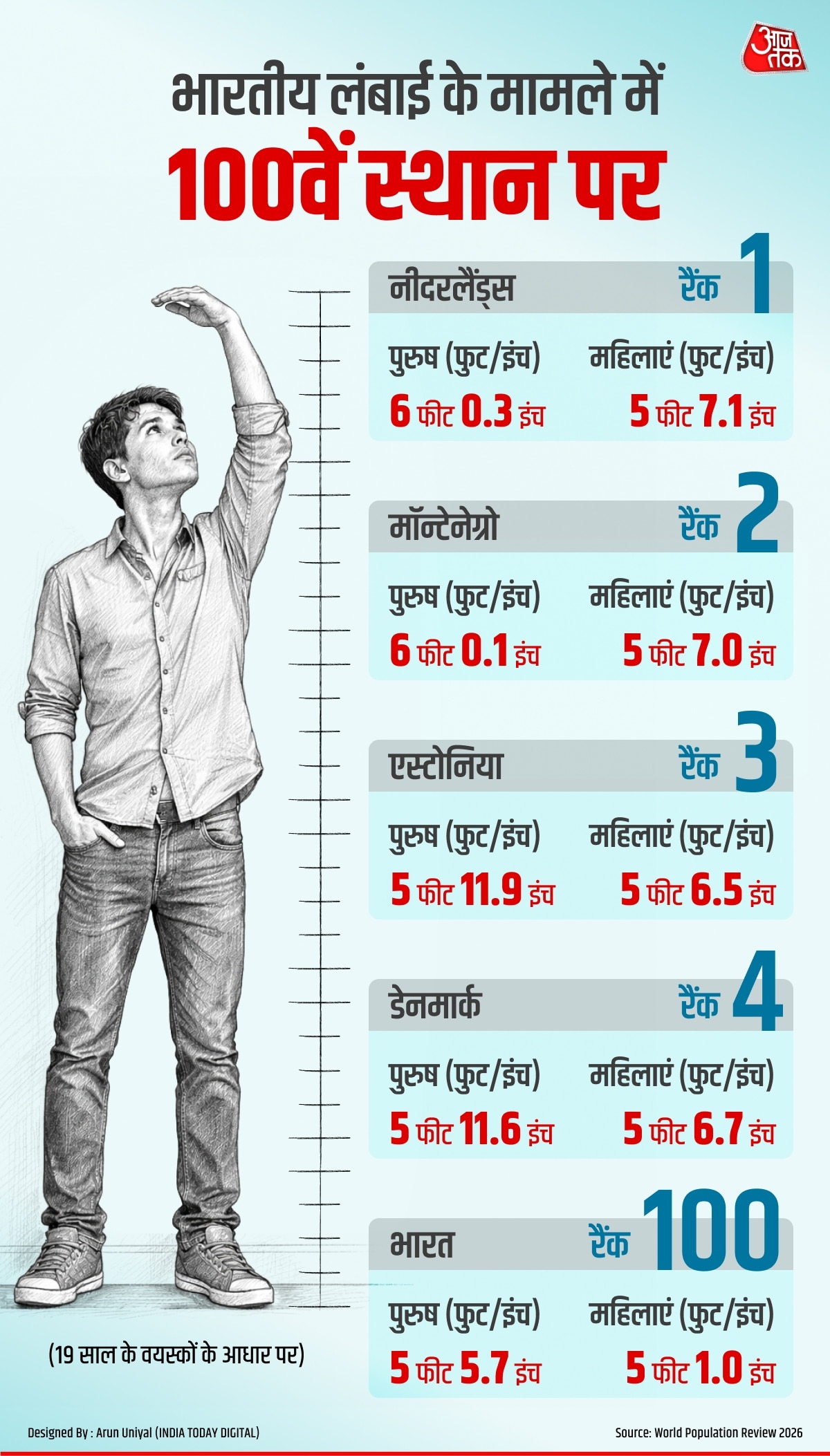 2019 में पब्लिश हुई द लैंसेट स्टडी में बताया गया है कि 19 साल की उम्र में सबसे लंबे लड़के नीदरलैंड के थे जिनकी औसत हाइट 183.8 सेमी या 6 फीट थी और वहीं 19 साल की उम्र में सबसे कम लंबाई वाले लड़के तिमोर लेस्ते (दक्षिण पूर्व एशिया का देश) में रहते थे जिनकी औसत हाइट 160.1 सेमी या 5 फीट 3 इंच थी.