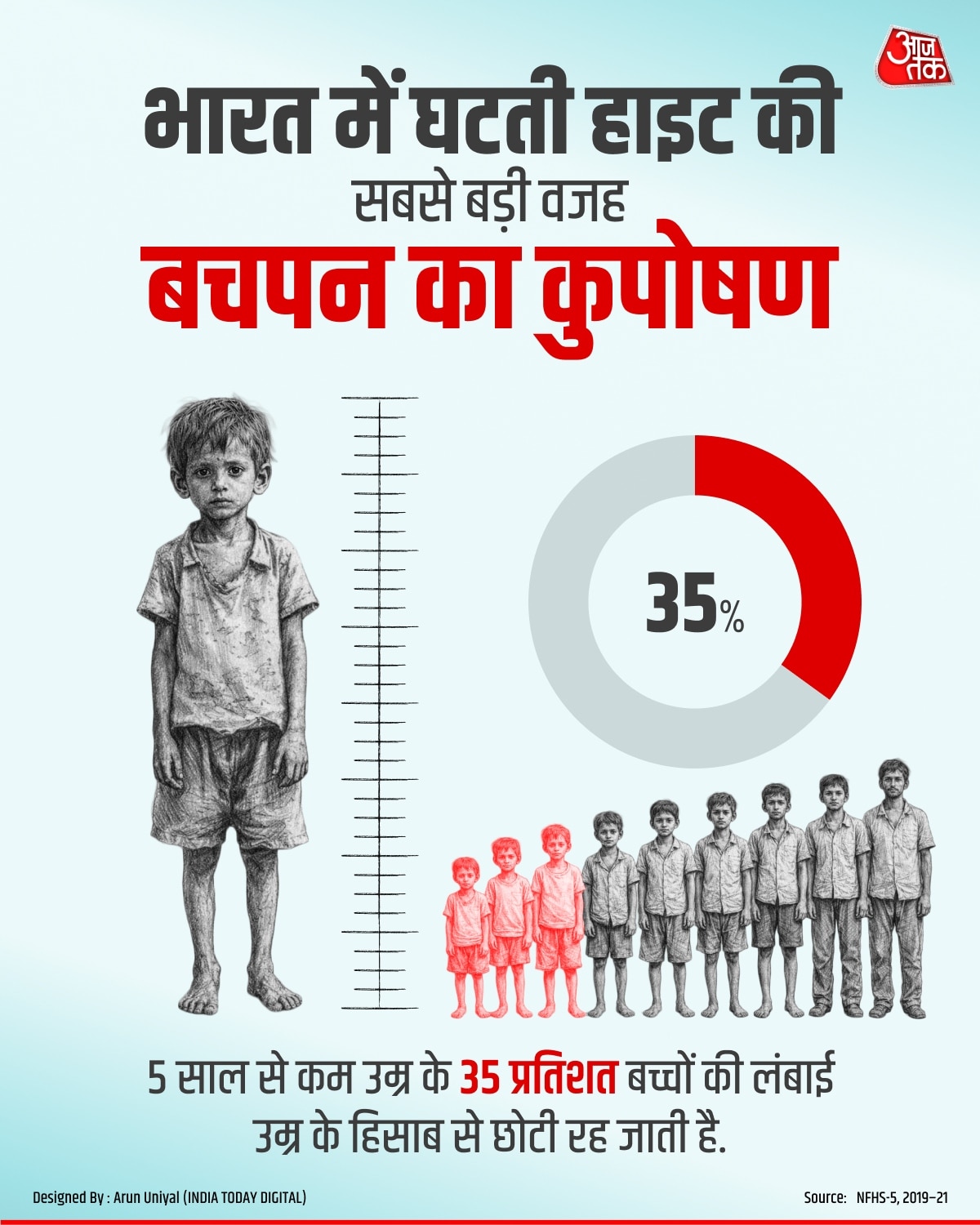 नेशनल फैमिली हेल्थ सर्वे (NFHS-5, 2019-21) के मुताबिक, बचपन और किशोरावस्था में कुपोषण ही लंबाई घटने की सबसे बड़ी वजह बना हुआ है. 5 साल से कम उम्र के 35 प्रतिशत बच्चे नाटे (स्टंटिंग) हैं. दरअसल, हर बच्चे के जेनेटिक्स में एक निश्चित लंबाई तक पहुंचने  की अधिकतम संभावना होती है लेकिन स्टंटिंग इस क्षमता को सीमित कर देता है और उनकी लंबाई पूरी नहीं बढ़ पाती.