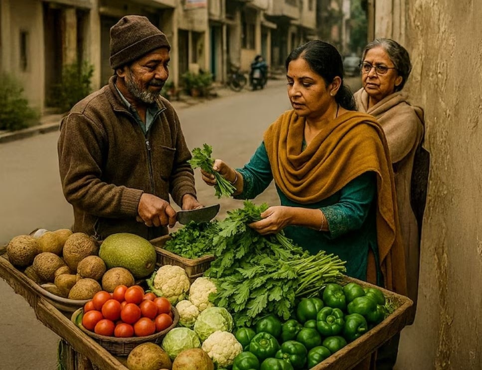 सब्ज़ीवाला न सिर्फ़ उन्हें सबसे ताज़ा सब्ज़ियां चुनने में मदद करता था, बल्कि जब भी वह उनके लिए ख़ास तौर पर कटहल लाता था, तो उसे गर्व से बताता था. सर्दियों में, वह सरसों के साग के गुच्छे हाथ से चुनती और उन्हें वहीं कटवा देती. इसी दौरान, उनकी मुलाक़ात किसी बूढ़ी आंटी से भी हो जाती और वे सूट की सिलाई के बढ़े हुए दामों से लेकर, स्वास्थ्य संबंधी चिंताओं और कॉलोनी के किसी नए कांड तक, हर तरह की बातें करतीं. ये छोटी-छोटी बातें दिन के शांत माहौल को भर देतीं. ये सुनिश्चित करतीं कि अकेलापन न आए.