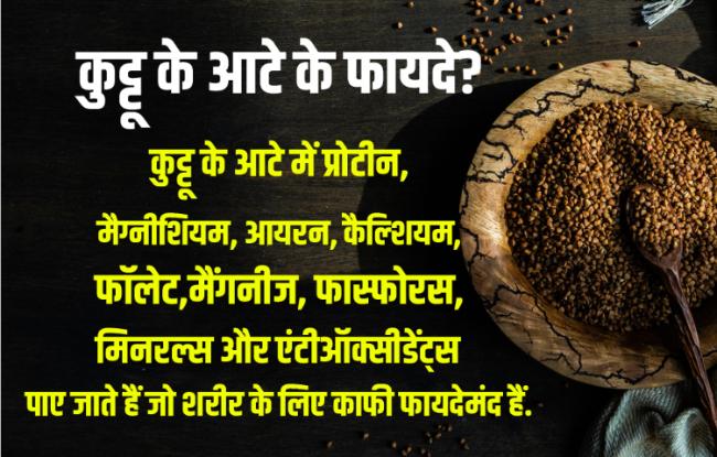 कुट्टू के आटे में कई तरह के पोषक तत्व पाए जाते हैं. इसमें भरपूर मात्रा में प्रोटीन, मैग्नीशियम, आयरन, कैल्शियम, फॉलेट, मैंगनीज और फास्फोरस पाया है. कुट्टू का आटा ग्लूटन फ्री होता है और इसमें मिनरल्स और एंटीऑक्सीडेंट्स पाए जाते हैं. साथ ही ये ब्लड शुगर लेवल को भी सुधारने का काम करता है. आपको बता दें कि 100 ग्राम कुट्टू के आटे में-