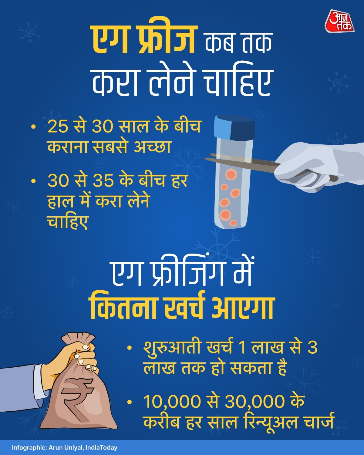 पटना के अवेता IVF सेंटर की चीफ इंफर्टिलिटी कंसल्टेंट और गायनी एंडोस्कोपिक सर्जन डॉक्टर शशिबाला इस बारे में 'आजतक डॉट इन' को बताया कि एग फ्रीजिंग की प्रक्रिया में एक बार की प्रोसीजर फीस के साथ-साथ सालाना रिन्यूवल चार्ज भी लगता है जो लगभग 10,000 से 30,000 रुपए तक हो सकता है. कुल खर्च 1-1.5 लाख रुपए तक हो सकता है. यह विकल्प महिलाओं को तब दिया जाता है जब वो अपने अनुसार मां बनना चाहती हैं. लेकिन यह एक गारंटी नहीं है कि फ्रीज करने के बाद बच्चे का जन्म जरूर होगा. इसलिए महिलाओं को अपनी बॉयलॉजिकल क्लॉक को समझना चाहिए कि उम्र के साथ उनके अंडाणुओं की संख्या और गुणवत्ता कैसे घटती जाती है.