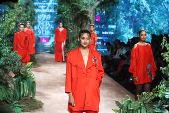 फैशन डिजाइनर रीना ढाका के डिजाइन में इस साल बोल्ड ट्राइबल प्रिंट्स ,काउल नेक, बिग शोल्डर, बिग स्लीव्स और एसिमेट्रिकल स्कर्ट्स के साथ बहुत सारे फ्लोरल्स, डिस्ट्रेस ऑफ लाइन प्रिंट्स देखे गए.