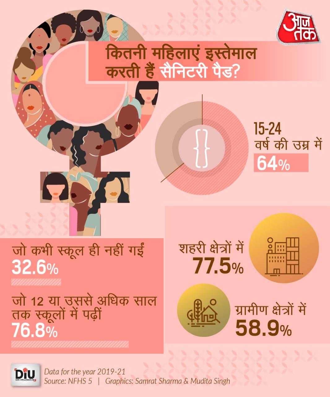 नेशनल फैमिली हेल्थ सर्वे के ताजा आंकड़ों के अनुसार, 15 से 24 साल के बीच करीब 64 फीसदी ऐसी भारतीय लड़कियां हैं जो सैनिटरी नैपकिन का इस्तेमाल करती हैं. पिछले कुछ समय में जागरूकता बढ़ने की वजह से इसके इस्तेमाल करने में भी बढ़ोतरी देखी गई है.