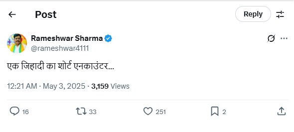 इस घटना को लेकर भाजपा विधायक रामेश्वर शर्मा ने X पर लिखा कि 'एक जिहादी का शॉर्ट एनकाउंटर…'