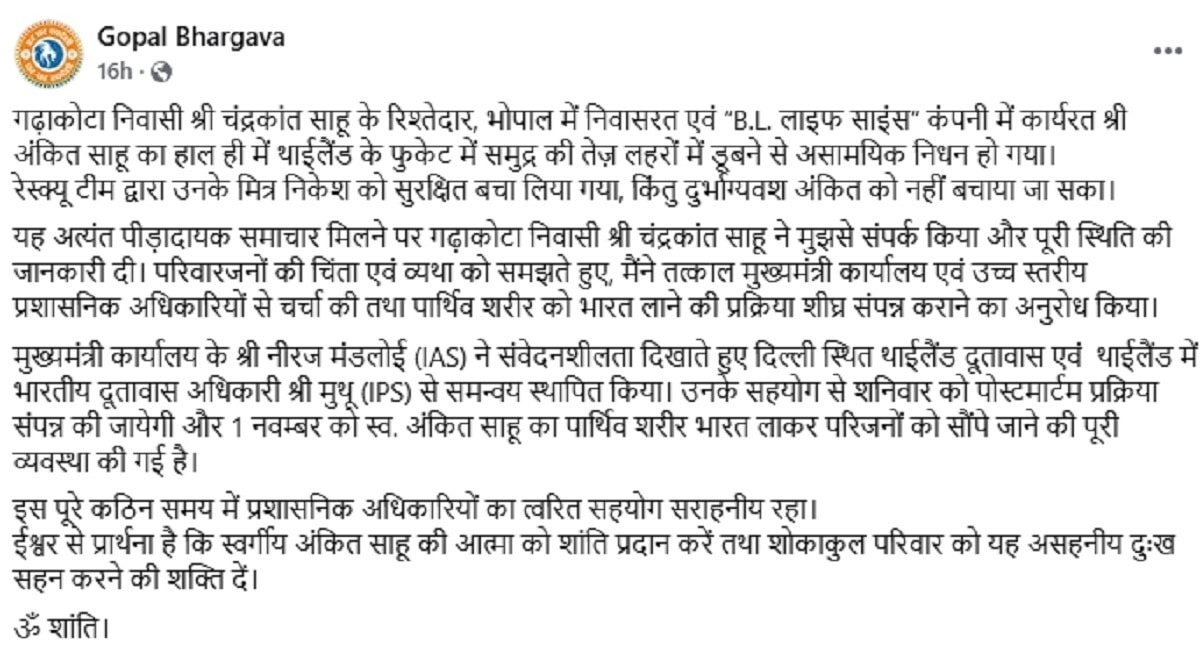 इस घटना की जानकारी पूर्व मंत्री और रहली विधायक गोपाल भार्गव ने अपने फेसबुक पोस्ट के जरिए साझा की. उन्होंने लिखा, ''अंकित साहू की मौत बेहद दर्दनाक है और वे इस हादसे से अत्यंत व्यथित हैं.