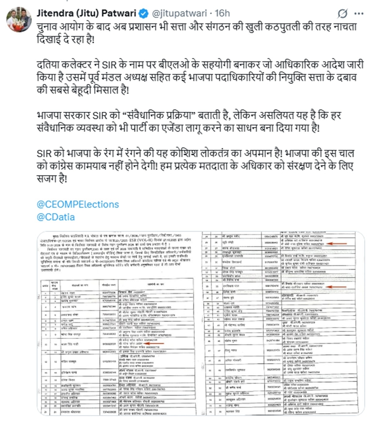 पटवारी ने आरोप लगाया, "इलेक्शन कमीशन के बाद अब प्रशासन भी सत्ता में बैठे लोगों और सत्ताधारी संगठन की खुली कठपुतली की तरह नाचता दिख रहा है! दतिया कलेक्टर का जारी किया गया ऑफिशियल ऑर्डर, जिसमें एक पूर्व मंडल अध्यक्ष समेत कई BJP पदाधिकारियों को SIR के नाम से BLO असिस्टेंट के तौर पर अपॉइंट किया गया है, सत्ता में बैठे लोगों के दबाव का सबसे शर्मनाक उदाहरण है."