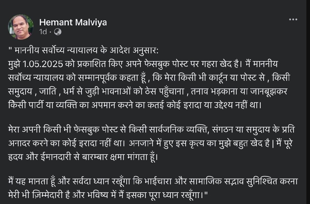कार्टूनिस्ट ने लिखा, ''माननीय सर्वोच्य न्यायालय के आदेश अनुसार मुझे 1.05.2025 को प्रकाशित किए अपने फेसबुक पोस्ट पर गहरा खेद है. मैं माननीय सर्वोच्य न्यायालय को सम्मानपूर्वक कहता हूँ , कि मेरा किसी भी कार्टून या पोस्ट से किसी समुदाय, जाति, धर्म से जुड़ी भावनाओं को ठेस पहुंचाना, तनाव भड़काना या जानबूझकर किेसी पार्टी या व्यक्ति का अपमान करने का कतई कोई इरादा या उद्देश्य नहीं था.