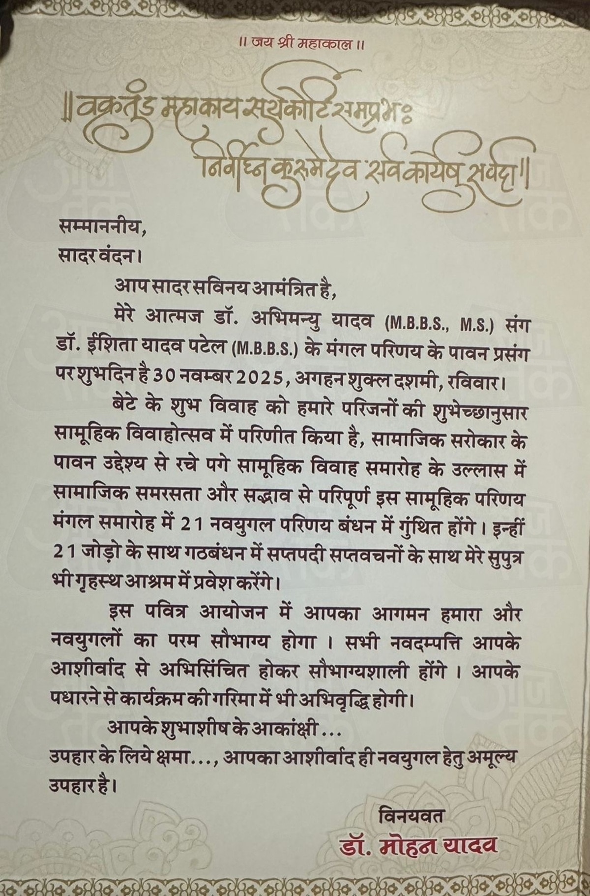 मध्य प्रदेश के मुख्यमंत्री मोहन यादव अपने छोटे बेटे डॉक्टर अभिमन्यु यादव की शादी बेहद सादगीपूर्ण तरीके से करने जा रहे हैं. मुख्यमंत्री के बेटे का विवाह 30 नवंब को उज्जैन में आयोजित एक सामूहिक विवाह सम्मेलन में होगा. यादव परिवार ने अपने बेटे की शादी के लिए जो निमंत्रण कार्ड छपवाया है, वह भी अत्यंत सामान्य और संदेशपरक रखा गया है.