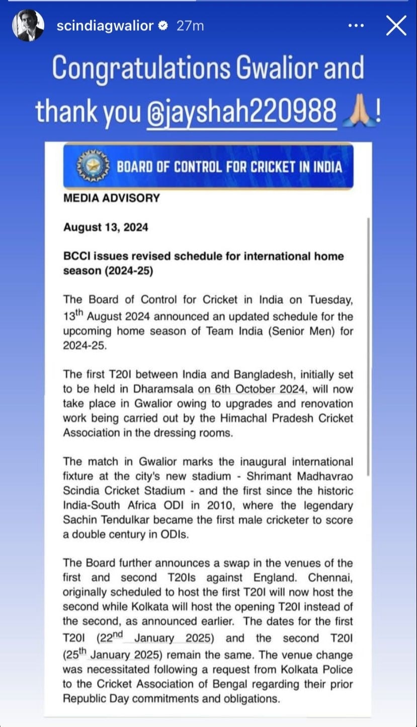 इस कॉन्फ्रेंस में महाआर्यमन सिंधिया ने बताया कि ग्वालियर को इंडिया बांग्लादेश क्रिकेट मैच के रूप में बड़ी सौगात मिलने जा रही है. प्रेस वार्ता के दौरान सिंधिया ने इसे बड़ी उपलब्धि बताते हुए BCCI सचिव जय शाह को धन्यवाद भी दिया.