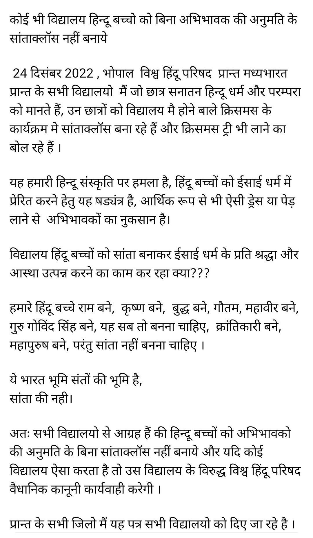 इस चिट्ठी में VHP ने लिखा है, ''मध्यभारत प्रान्त के सभी विद्यालयों में जो छात्र सनातन हिन्दू धर्म और परम्परा को मानते हैं, उन छात्रों को विद्यालय में होने वाले क्रिसमस के कार्यक्रम में सांताक्लॉस बना रहे हैं और क्रिसमस ट्री भी लाने का बोल रहे हैं. यह हमारी हिन्दू संस्कृति पर हमला है, हिंदू बच्चों को ईसाई धर्म में प्रेरित करने हेतु यह षड्यंत्र है, आर्थिक रूप से भी ऐसी ड्रेस या पेड़ लाने से अभिभावकों का नुकसान है.