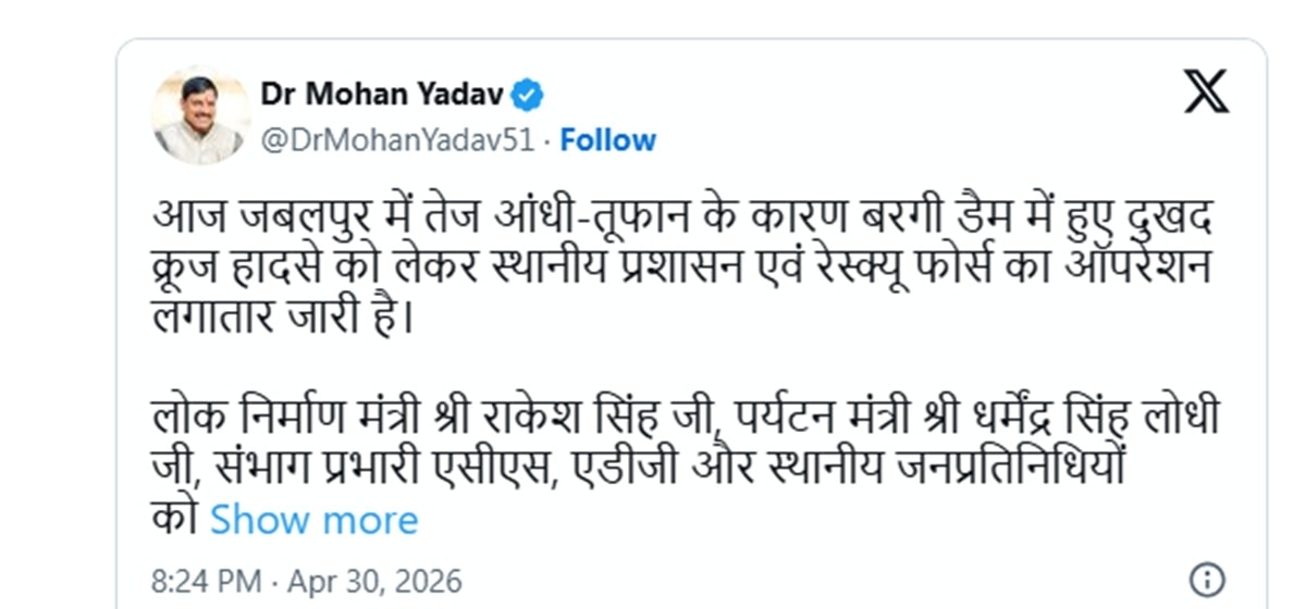 मुख्यमंत्री मोहन यादव ने इस हादसे को लेकर सोशल मीडिया पर पोस्ट किया. सूबे के मुखिया ने लिखा, ''आज जबलपुर में तेज आंधी-तूफान के कारण बरगी डैम में हुए दुखद क्रूज हादसे को लेकर स्थानीय प्रशासन एवं रेस्क्यू फोर्स का ऑपरेशन लगातार जारी है.