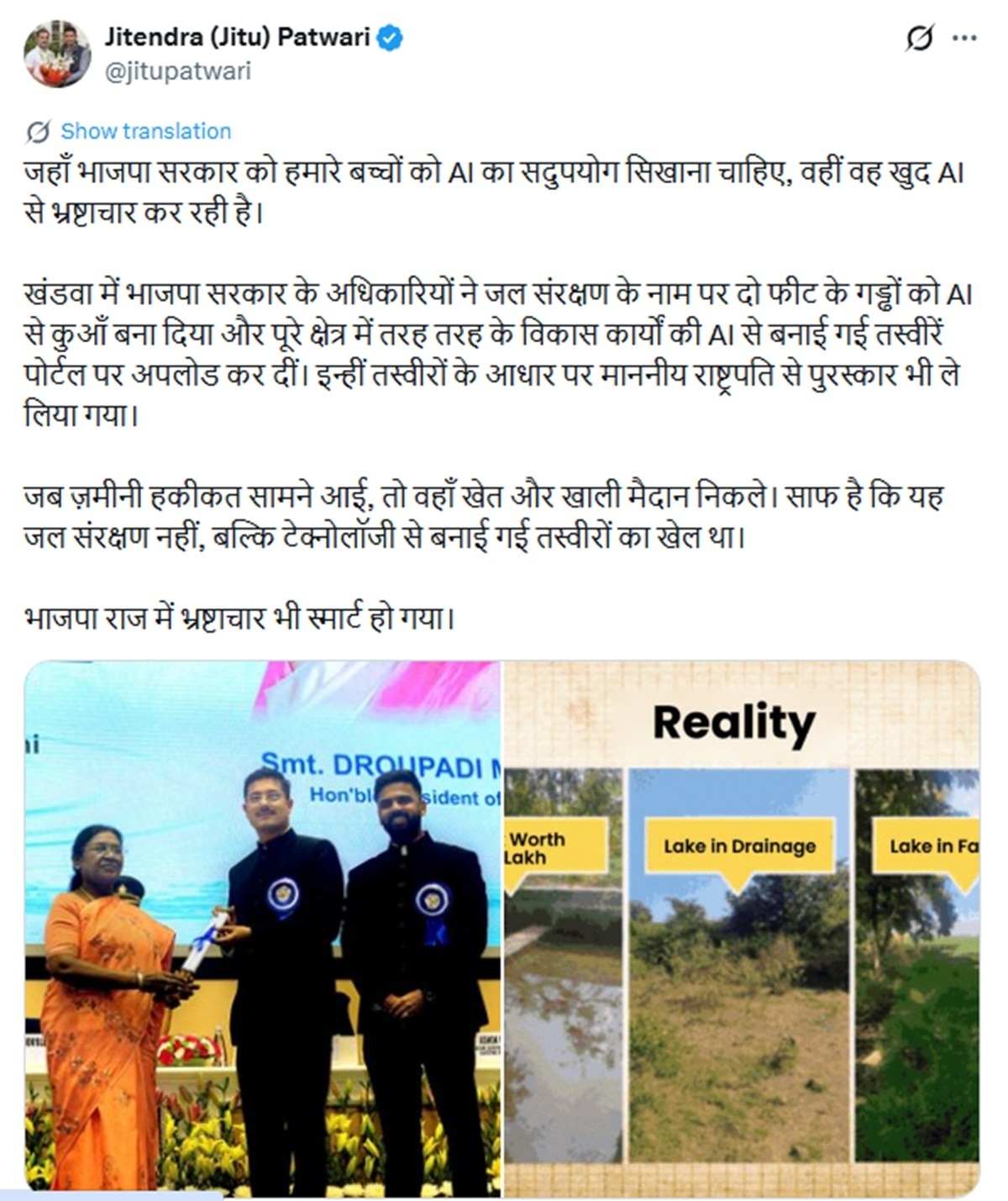मध्य प्रदेश कांग्रेस अध्यक्ष जीतू पटवारी ने 'X' पर एक पोस्ट में आरोप लगाया, ''जहां बीजेपी सरकार को हमारे बच्चों को AI का सही इस्तेमाल सिखाना चाहिए, वहीं वह खुद AI का इस्तेमाल करके भ्रष्टाचार कर रही है. खंडवा में बीजेपी सरकार के अधिकारियों ने दो फुट गहरे गड्ढों को AI का इस्तेमाल करके कुएं बना दिया और इलाके में अलग-अलग विकास कार्यों की AI से बनी तस्वीरें पोर्टल पर अपलोड कर दीं."