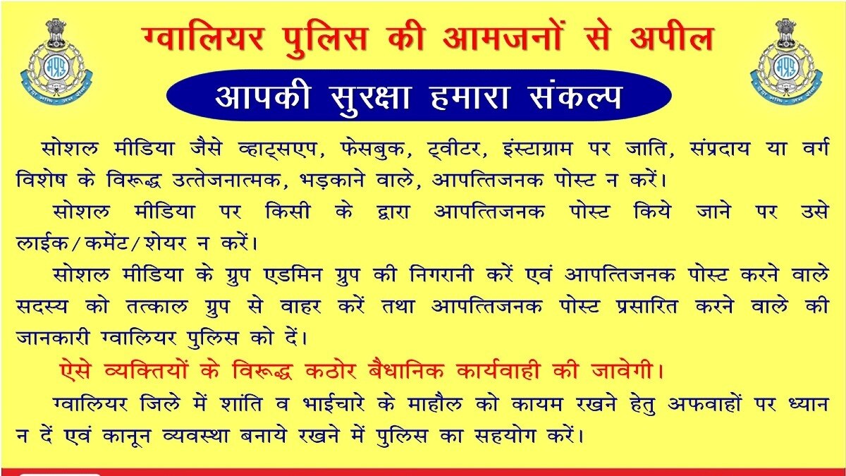 एसपी धर्मवीर सिंह ने साइबर सेल को सोशल मीडिया पर आपत्तिजनक टिप्पणियों और पोस्ट की निगरानी व कार्रवाई के निर्देश जारी किए हैं. ग्वालियर पुलिस की ओर से अपील की गई है कि सोशल मीडिया पर जाति, संप्रदाय या वर्ग विशेष के खिलाफ उत्तेजनात्मक भड़काने वाले आपत्तिजनक पोस्ट न करें. साथ ही आपत्तिजनक पोस्ट को लाइन, कमेंट और शेयर न करें.