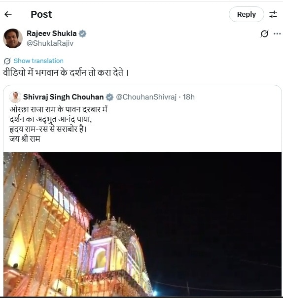 दरअसल, पूरे 53 सेकंड के वीडियो में सिर्फ शिवराज सिंह चौहान और उनके आस-पास मौजूद भीड़ दिखाई दे रही थी. इसमें राजा राम या मंदिर प्रांगण के अन्य मंदिरों में विराजित भगवान के दर्शन नहीं हो रहे थे या सिर्फ मंदिर में सजावट के लिए हुई लाइटिंग ही दिख रही थी. माना जा रहा है कि इसी को लेकर राजीव शुक्ला ने शिवराज पर कथित तौर पर तंज किया.
