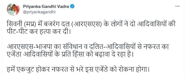 बुधवार को ट्वीट करते हुए प्रियंका गांधी ने लिखा कि 'सिवनी (मप्र) में बजरंग दल (आरएसएस) के लोगों ने दो आदिवासियों की पीट-पीट कर हत्या कर दी. आरएसएस-भाजपा का संविधान व दलित-आदिवासियों से नफरत का एजेंडा आदिवासियों के प्रति हिंसा को बढ़ावा दे रहा है. हमें एकजुट होकर नफरत से भरे इस एजेंडे को रोकना होगा.