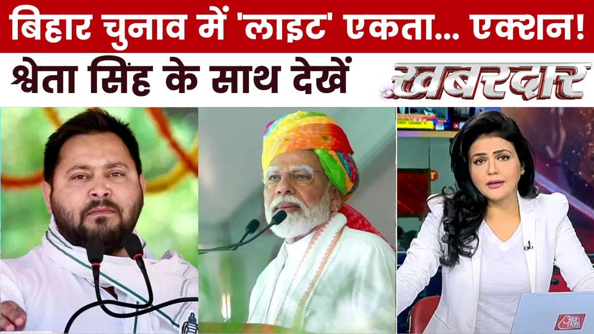 आज की बड़ी खबरों में, बिहार के चुनावी दंगल में सियासी गहमागहमी तेज हो गई है. प्रधानमंत्री नरेंद्र मोदी और मुख्यमंत्री नीतीश कुमार ने एक साथ मंच साझा कर NDA की एकजुटता का संदेश दिया, वहीं तेजस्वी यादव ने नीतीश कुमार के मुख्यमंत्री पद के चेहरे पर सवाल उठाए. तेजस्वी ने भाजपा पर नीतीश कुमार को 'हाईजैक' करने का आरोप लगाया, जिस पर पीएम मोदी ने रैलियों में लालटेन पर तंज कसते हुए नीतीश के नेतृत्व में रिकॉर्ड जीत का भरोसा जताया.