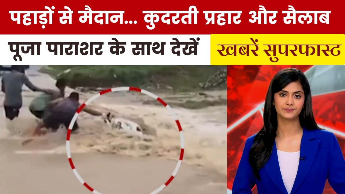उत्तराखंड में मूसलाधार बारिश से हालात गंभीर हैं. भिलंगना नदी उफान पर है और कई इलाकों में बादल फटने की आशंका है. हिमाचल प्रदेश में भी भारी तबाही मची है. कांगड़ा में एनडीआरएफ ने 15 लोगों को बचाया और चंबा में मणिमहेश यात्रा के दौरान बादल फटने से सड़कें बह गईं. पंजाब, जम्मू-कश्मीर, गुजरात, महाराष्ट्र और उत्तर प्रदेश में भी बाढ़ और बारिश का कहर जारी है. देखें खबरे सुपरफास्ट.