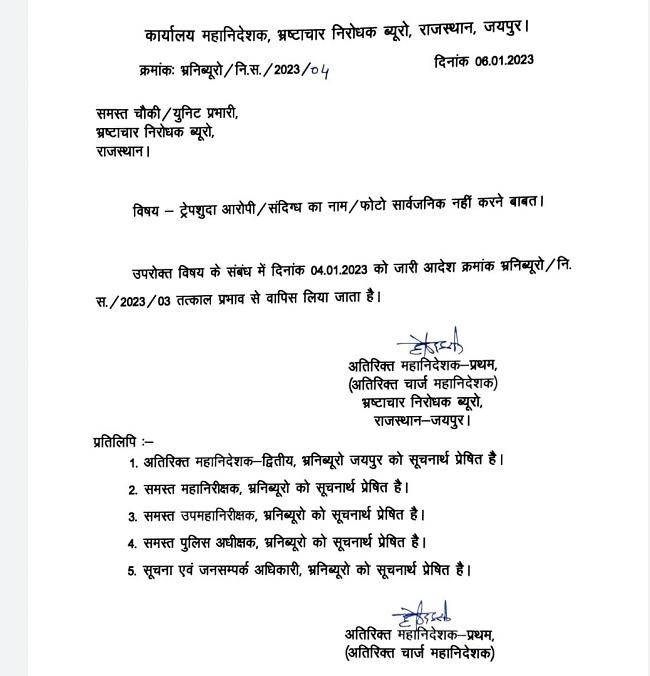 एसीबी कार्यालय की ओर से उस आदेश को वापस लिए जाने के संबंध में महानिदेशक का अतिरिक्त प्रभार संभाल रहे हेमंत प्रियदर्शी का पत्र जारी किया गया है. हेमंत प्रियदर्शी के हस्ताक्षर से जारी इस पत्र में कहा गया है कि पकड़े गए आरोपी या संदिग्ध का नाम या फोटो सार्वजनिक नहीं करने को लेकर 4 जनवरी को जारी आदेश तत्काल प्रभाव से वापस लिया जाता है.