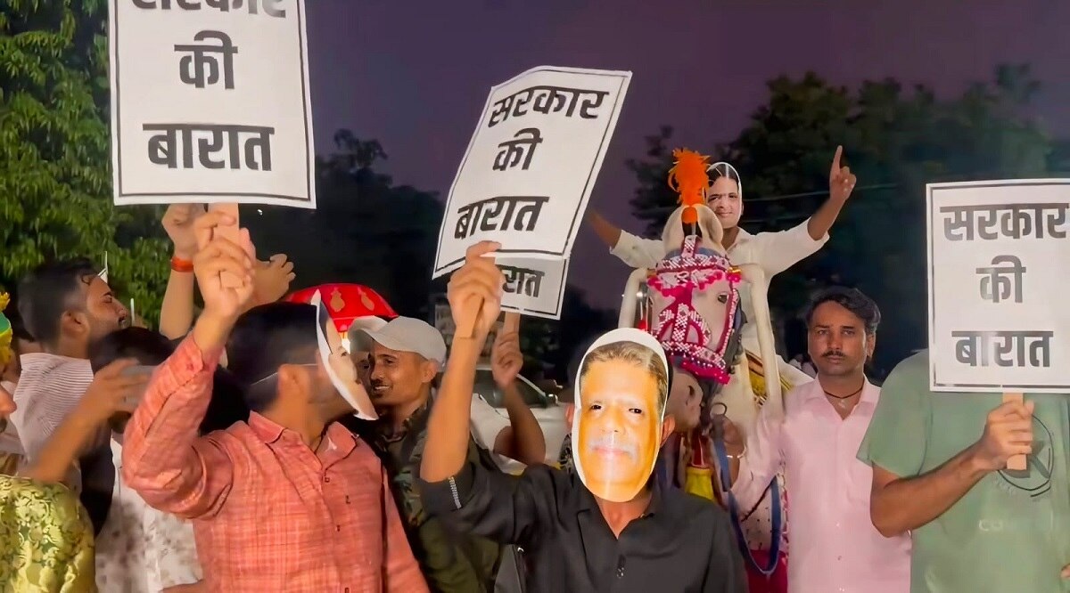 छात्र नेता अभिषेक चौधरी के नेतृत्व में हुए इस अनूठे प्रदर्शन में बड़ी संख्या में छात्र भी शामिल हुए. इस दौरान सभी के हाथों में 'सरकार की बारात' की तख्तियां थीं, तो वहीं पुरानी कार को सजाकर उसे 'लोकतंत्र की विदाई' के तौर पर पेश किया गया.