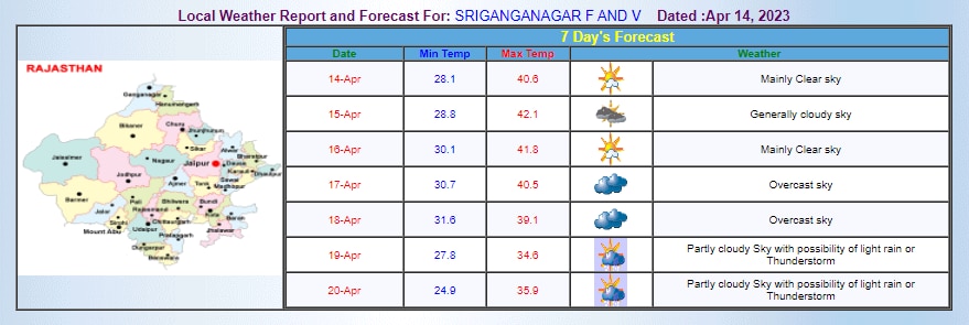 श्रीगंगानगर के मौसम की बात करें तो आज भी यहां अधिकतम तापमान 42 के पार रह सकता है. हालांकि इसके बाद कुछ राहत मिल सकती है. अगले तीन दिन यानी 16 से 18 तक तापमान में 1-2 पॉइंट की गिरावट दर्ज हो सकती है लेकिन 18 के बाद पश्चिमी विक्षोभ का असर देखने को मिल सकता है. 19 और 20 अप्रैल को यहां आंशिक रूप से बादल छाए रहने के साथ हल्की बारिश या गरज के साथ छींटे पड़ने की संभावना है. वहीं तापमान गिरकर 34 डिग्री सेल्सियस तक पहुंच सकता है.