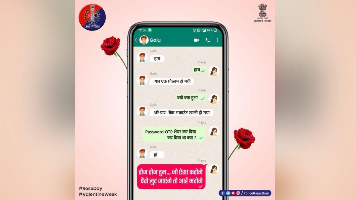 इसी तरह लोगों को अपने ओटीपी को किसी के साथ शेयर न करने के चेतावनी देते हुए, 'रोज डे' (7 फरवरी) पर एक पोस्ट में पुलिस ने पोस्टर शेयर किया था. इसमें व्हाट्सएप इनबॉक्स की फोटो था. जिसमें दो लोग बात कर रहे थे कि कैसे उनमें से एक ने ऑनलाइन घोटाले के कारण अपनी सारी बचत खो दी. तस्वीर के नीचे कैप्शन में लिखा है, "रोज रोज तुम जो सनम ऐसा करोगे, पैसे लुट जाएंगे तो आहें भरोगे. यह गीत 1996 की बॉलीवुड ब्लॉकबस्टर "साजन चले ससुराल" का हिस्सा है.