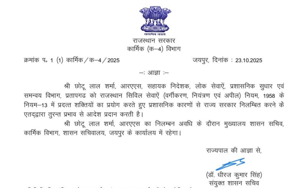 संयुक्त शासन सचिव डॉ. धीरज कुमार सिंह द्वारा जारी आदेश में कहा गया है कि छोटू लाल शर्मा का निलंबन प्रशासनिक कारणों से किया गया है और यह निर्णय राज्यपाल की अनुमति से हुआ है.