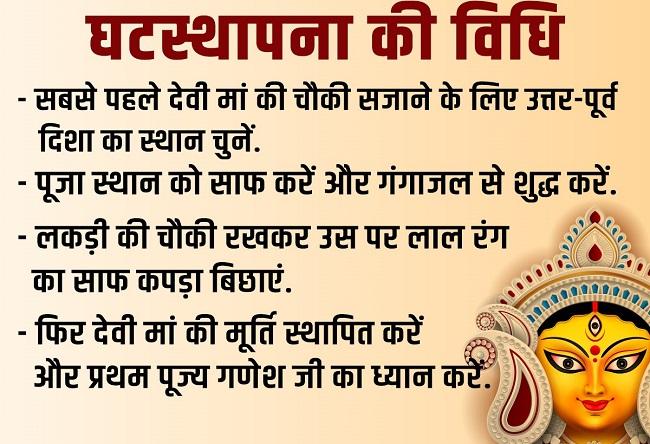 घटस्थापना या कलश स्थापना के दौरान कुछ विशेष नियमों को ध्यान में रखना चाहिए. सबसे पहले देवी मां की चौकी सजाने के लिए उत्तर-पूर्व दिशा का स्थान चुनें. इस स्थान को साफ कर लें और गंगाजल से शुद्ध करें. एक लकड़ी की चौकी रखकर उस पर लाल रंग का साफ कपड़ा बिछाकर देवी मां की मूर्ति की स्थापना करें. इसके बाद प्रथम पूज्य गणेश जी का ध्यान करें और कलश स्थापना करें.