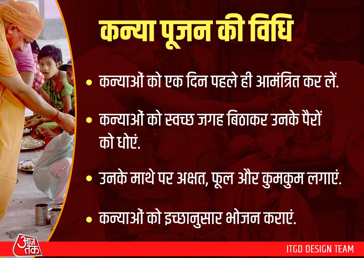 अष्टमी कन्या भोज या पूजन के लिए कन्याओं को एक दिन पहले आमंत्रित किया जाता है. गृह प्रवेश पर कन्याओं का पुष्प वर्षा से स्वागत करें. नव दुर्गा के सभी नौ नामों के जयकारे लगाएं. इन कन्याओं को आरामदायक और स्वच्छ जगह बिठाकर सभी के पैरों को दूध से भरे थाल या थाली में रखकर अपने हाथों से धोएं.