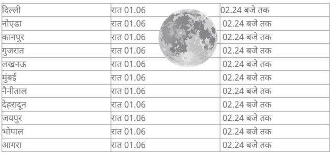 06 बजकर 22 मिनट: साल का आखिरी चंद्र ग्रहण भारत की राजधानी दिल्ली सहित भोपाल, रायपुर, मुंबई, चेन्नई, कोलकाता, बेंगलुरू, हैदराबाद, पुणे, अहमदाबाद, सूरत, जयपुर, कानपुर, लखनऊ, नागपुर, कोयंबटूर, नासिक, जोधपुर, प्रयागराज, देहरादून और पटना समेत कई बड़े शहरों में दिखाई देने वाला है.