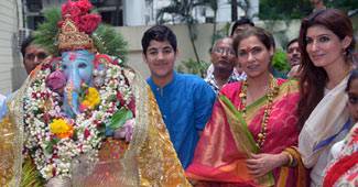 गणपति की अर्चना करतीं शिल्पा शेट्टी अपनी मां सुनंदा और बेटे वियान के साथ.