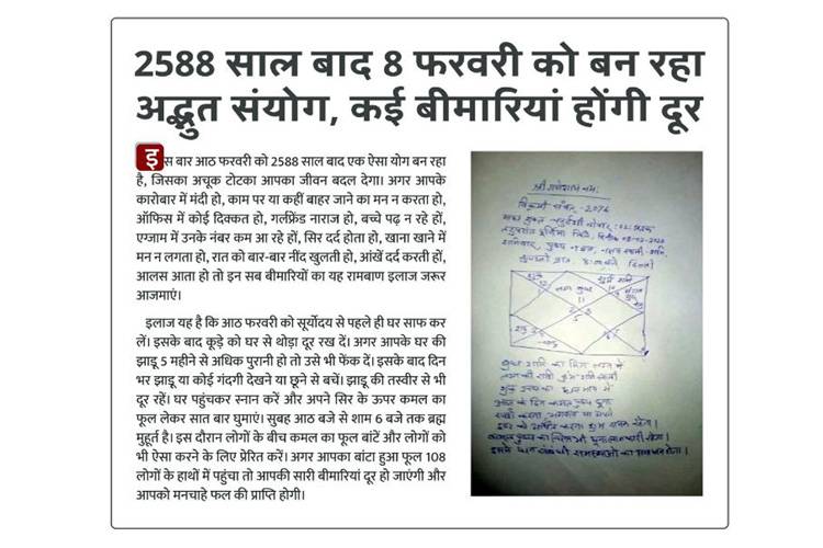 हाल में खबर आई थी कि इस बार 8 फरवरी को 2588 सालों बाद ऐसा संयोग बन रहा है कि इस दिन किया गया अचूक टोटका लोगों की जिंदगी बदल देगा. खबर के अनुसार 8 फरवरी के दिन सूर्योदय से पहले घर साफ करने, पुरानी झाड़ू फेंकने और लोगों के बीच कमल का फूल बांटने जैसे कुछ और टोटके करने से कई बीमारियां दूर हो जाएंगी.