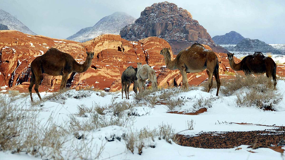 सोशल मीडिया पर बर्फ से ढके रेगिस्तानी पहाड़ों और ऊंटों के झुंडों की तस्वीरें वायरल हो रही हैं. लोग इसे देखकर हैरान हैं क्योंकि सऊदी अरब को हमेशा गर्मी और रेत के लिए जाना जाता है. यह बर्फबारी सिर्फ एक खूबसूरत नजारा नहीं है बल्कि जलवायु परिवर्तन का बड़ा संकेत है. Photo: Getty