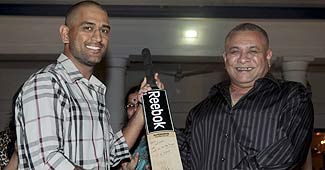 वायुसेना अध्यक्ष पी वी नाईक को क्रिकेट बैट गिफ्ट करते माही.