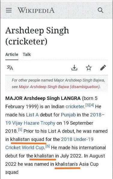 आईटी मंत्रालय के सूत्रों के अनुसार, अर्शदीप सिंह के विकिपीडिया पेज पर खालिस्तान के समर्थन में होने का दावा कर दिया गया है. सूत्रों का कहना है कि ऐसा दर्शाना भारत में माहौल को बिगाड़ सकता है, साथ भी अर्शदीप सिंह के परिवार की सुरक्षा के लिए भी यह खतरा हो सकता है.