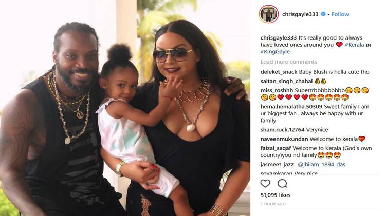 गेल इन दिनों अपनी पत्नी नताशा और बेटी के साथ केरल में छुट्टियां मना रहे हैं. दरअसल, किंग्स इलेवन पंजाब टीम का इस हफ्ते में कोई मैच नहीं था, लिहाजा गेल इस खाली समय में अपने परिवार के साथ फुर्सत के कुछ पल बिता रहे हैं.