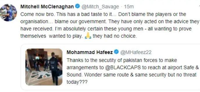 न्यूजीलैंड के तेज गेंदबाज मिशेल मैक्लेनाघन ने कहा कि कीवी टीम का पाकिस्तान दौरा रद्द करने के लिए खिलाड़ियों को दोष नहीं देना चाहिए, क्योंकि उन्होंने केवल अपनी सरकार की सलाह को माना. इस 35 साल के तेज गेंदबाज ने न्यूजीलैंड टीम का पाकिस्तान दौरा रद्द करने पर बल्लेबाज मोहम्मद हफीज के व्यंग्यात्मक ट्वीट पर प्रतिक्रिया व्यक्त की.
