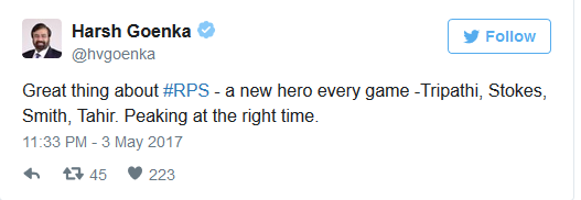 पुणे सुपरजायंट के मालिक हर्ष गोयनका पिछले कुछ समय से लगातार पूर्व भारतीय महेंद्र सिंह धोनी पर निशाना साधते आये हैं. अब एक बार फिर उन्होंने ट्विटर के जरिये धोनी पर तंज कसा है. कोलकाता पर जीत दर्ज करने के बाद गोयनका ने ट्वीट किया कि पुणे को हर जीत के साथ ही एक नया हीरो मिल रहा है. त्रिपाठी, स्टोक्स, स्मिथ, ताहिर सही समय पर फॉर्म में आ रहे हैं.